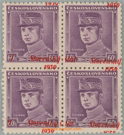 Philately. Sy.10 ZPP+VPP, Stefanik 60h violet, block of four with shifted overprint downward and as well transport to to perf; mint never hinged, slightly povolena perf between stamp., decorative, c.v.. 140EUR (Image) (Image2)