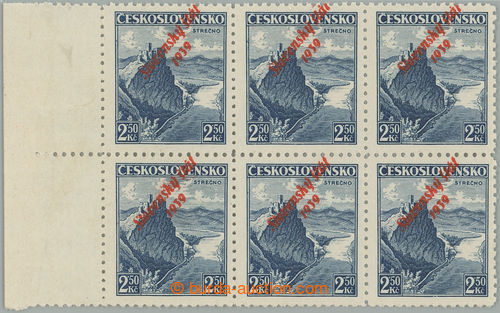 Philately. Sy.17 ZPP, Strecno 2,50CZK blue, L marginal block-of-6 with significant vertical shifted overprint outside picture stamp.; mint never hinged, c.v.. 180EUR+, rare (Image) (Image2)