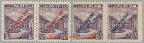 Philately. Sy.19a+b, Slavkov 3,50CZK violet, 2x horizontal pair with red resp. blue overprint; mint never hinged, minor gum fault, exp. by Kaufmann., Kozak and Slovak philatelist (Image) (Image2)