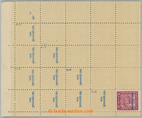 Philately. Sy.13 plate mark, Mukachevo 1,20CZK violet, LL corner blk-of-4 with wide margin and plate mark 1A, IV. variant - 50 pcs of sheet imprinted the bottom half overprint folder; mint never hinged, exp. Synek, mark Kaufmann (Image) (Image2)