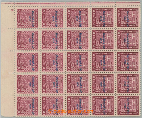 Philately. Sy.6 SOP, Coat of arms 30h violet, L the bottom corner blk-of-25 with plate number 2 and with machine offset overprint on 12 stamp., from that 10x full; mint never hinged, on reverse through/over L upper stamp. mounted