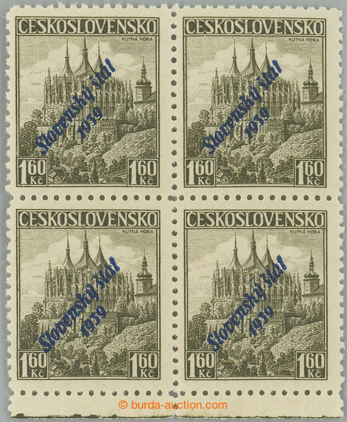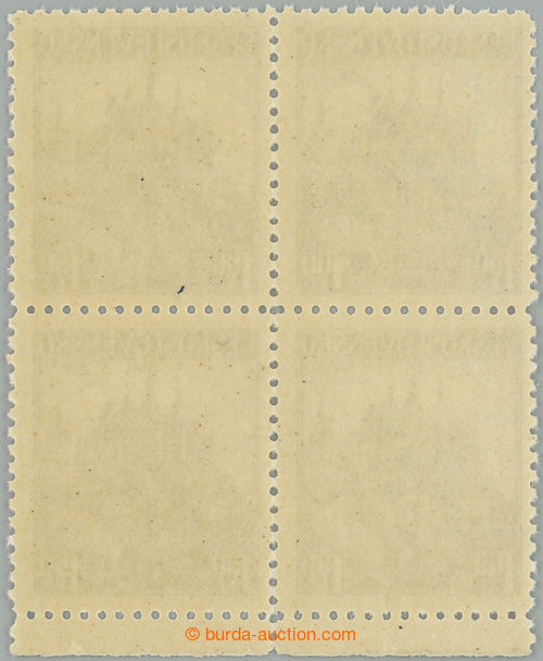 Philately. Sy.15, 1,60CZK olive, block of four with bottom close margin, 100 pcs of counter sheet, overprint combination types - open 9 on pos. 93; mint never hinged (Image) (Image2)