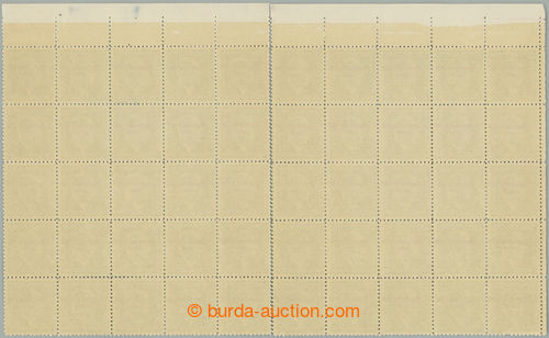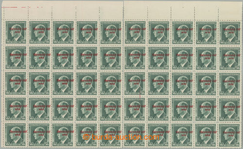 Philately. Sy.8 VPP, Benes 50h green, L upper corner blk-of-50 divided vertical on/for two middle, all stamp. with shifted overprint R outside picture stamp., also print nastavovaci ledge above PPo1-2 and through/over 3 stamp.