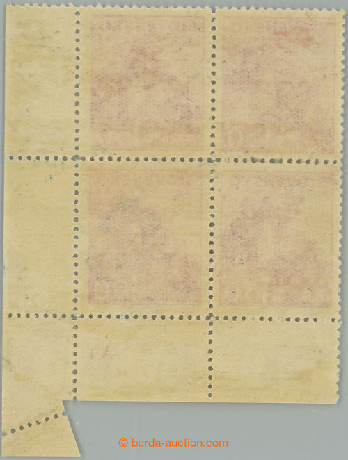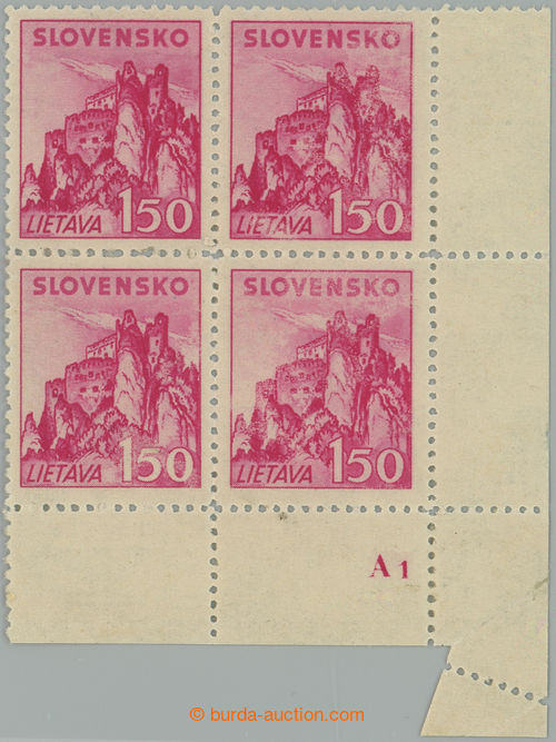 Philately. Sy.53 production flaw, Castle Lietava 1,50 Koruna, LR corner blk-of-4 with plate number A1 and with significant perf and orezovou folded paper in corner; in/at area repaired gum, decorative (Image) (Image2)