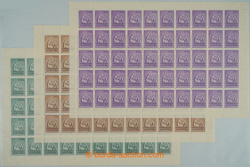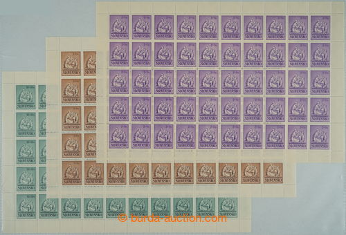 Philately. COUNTER SHEET / Sy.75-80, Slovak ucene tovarysstvo, complete set of in/at 50 pcs of sheets, incl. interesting plate variety, value 1,30 Koruna sheets from both plate; folded only in perforation, value 1Ks small spots,