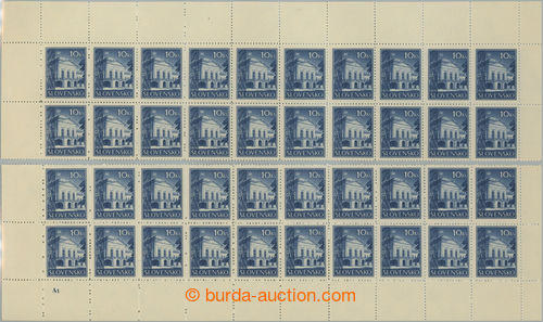 Philately. PASY / Sy.46z plate mark + plate variety, Presidential Palace 10 Koruna blue, upper and lower bnd-of-20 with margin and plate mark A1, wmk P4, incl. plate variety - zerd on/for roof, pos. 9; mint never hinged, only light