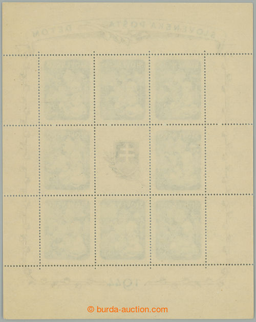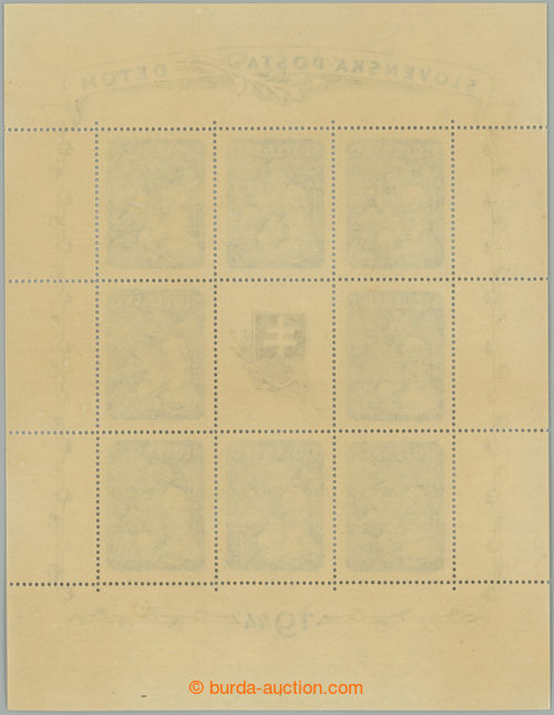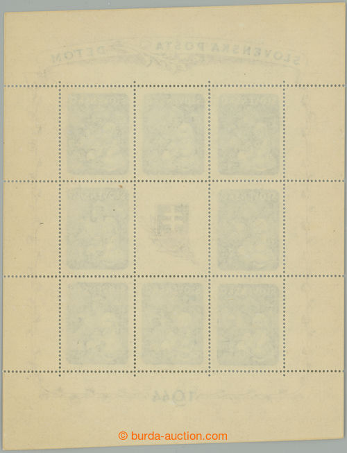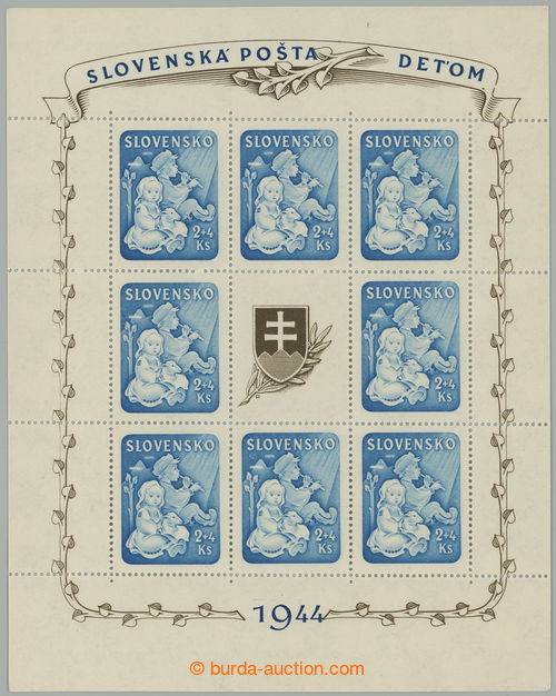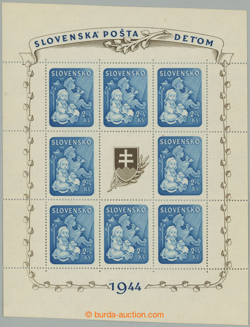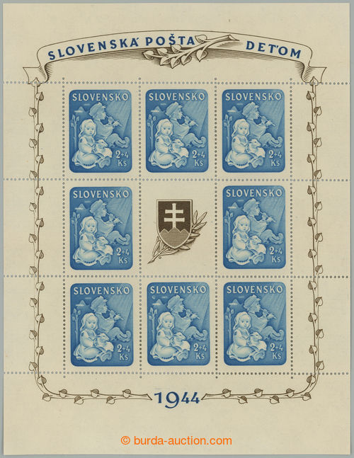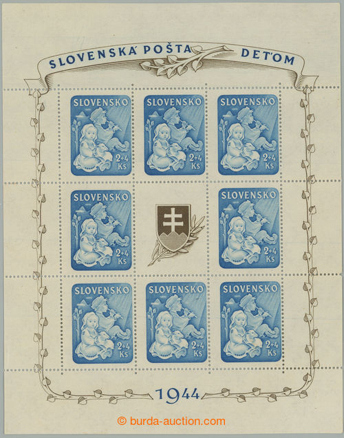 Philately. Sy.H119, miniature sheet For Children-issue, miniature sheet field G, plate variety on pos. 7 - stain in V Slovakia + significant shifted perforation L-wards + thin horiz. lines printing color through/over all horiz.
