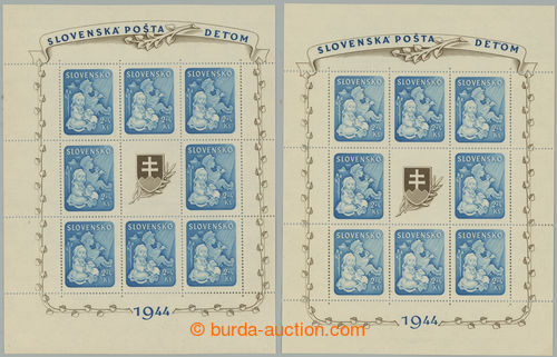 Philately. Sy.H119, miniature sheet For Children-issue 2 pcs of, miniature sheet field D shifted perforation and cut + shift inscription Slovak post detom to dolnimu margin ribbon, miniature sheet field G shift inscription to to
