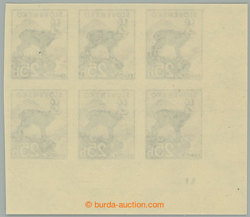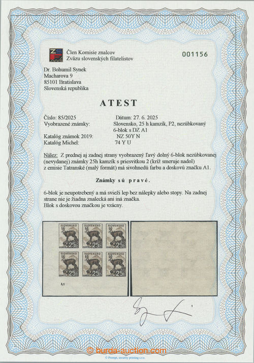 Philately. Sy.NZ50YN plate mark, Tatra 25h black-brown, imperforated L the bottom corner blk-of-6 with plate number A1; mint never hinged, certificate Synek, in larger entireties, in addition with plate number, rare! (Image) (Image2)