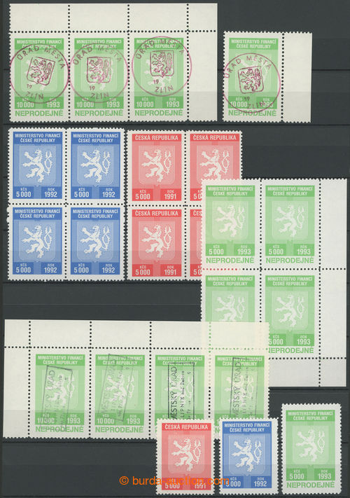 Revenue Stamps. MINISTRY OF FINANCE / selection of 23 stamp. to payment fees after/behind transport playing automatu, contains 5.000Kcs 1991, 1992, 1993 and 10.000Kcs 1993, these with additionally printed cancel. MU ZLIN and LIPNIK