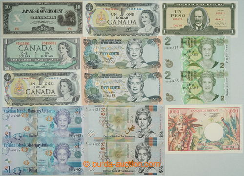 Banknotes. OVERSEAS / selection of 20 pcs of bank-notes from exotictejsich destinations as Canada, Hongkong, Fiji, Kajmanske islands, Bahamy, Kuba and oths., also fanciful bank-note Guyany from Francek's Mediny; some 2x, various