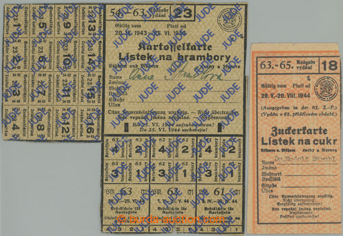 Revenue Stamps. RATION CARDS FOR ZIDY / Bohemian and Moravian potravinovy card on/for potatoes with overprint JUDE, used, also with coupon common card on/for cukry; good condition, cards for Zidy occur only rarely! (Image) (Image2)