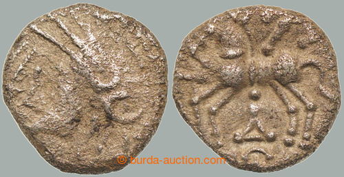 Numismatics. GREECE - GALLIA / MASSALIA / Ag drachma, Av.: ovencena head Artemidy from R, on/for zadech luk and toulec / Rv.: ΜΑΣΣΑΛΙΗΤΩΝ, kracejici lion transport, between legs N-A, weight 2,65 g, BN.1239-41; excentricka, nice