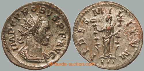 Numismatics. RIM / Probus (276-282), AE antoninianus, Rv.: FIDES MILITVM, standing Fides from the L drzi two military standarty, in/at exergu III, mint Lugdunum, RIC 29; fine zachovalost with almost plne dochovanym original