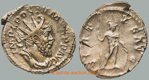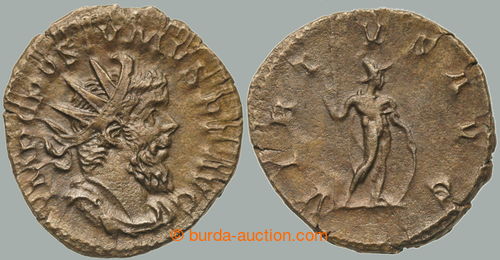 Numismatics. RIM / Postumus (260-269), Bi antoninianus, Rv.: VIRTVS AVG, standing Virtus from R drzi peak/plate and opira with about/by ostep, mint Lugdunum, weight 3,58 g, RIC 93; irregular strizek napraskly razbou, nice toned (Image)