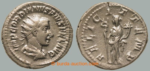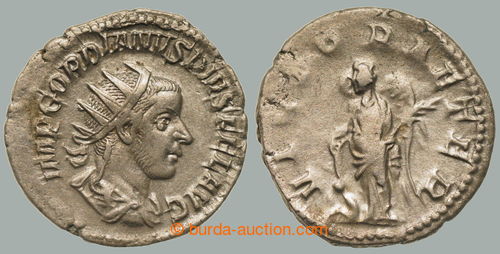 Numismatics. RIM / Gordianus III. (238-244), Ag antoninianus, Rv.: FELICIT TEMP, standing Felicitas from the L drzi corner hojnosti and opira with about/by caduceus, mint Rome, weight 4,44 g, RIC 140 (Image)