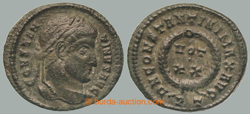 Numismatics. RIM / Constantinus I. Veliky (306-337), AE 3, Rv.: DN CONSTANTINI MAX AVG, VOT/XX in wreath, in/at exergu special commemorative print, mint Ticinum, RIC VII 140,P; fine toned (Image)