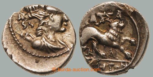 Numismatics. GALLIA BELGICA / LINGONES (Lingonove) / AR quinarius, Av.: stylized head Romy in/at helmet from the L / Rv.: KAΛETΔOY, stylizovany bezici horse from the L, weight 1,75 g, DT.3196, RIG.92; nice toned (Image)