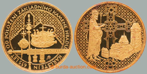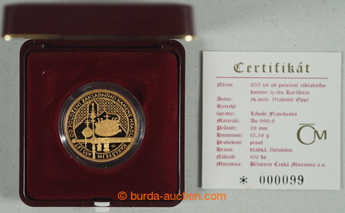 Numismatics. CESKA MINCOVNA / Au medal 655. anniv of foundation Karlstejna (V. Oppl), Au 0.999, 28 mm, 15,56 g, proof, printing 100 pcs of, placed in original etui with certificate; small spots (Image) (Image2)
