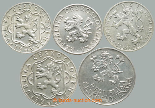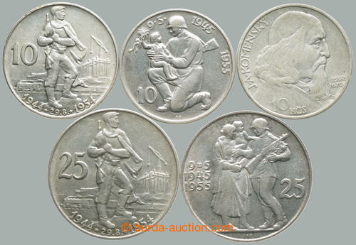 Numismatics. CZECHOSLOVAKIA 1945-92 / comp. 5 pcs of memorial/special Ag minci: 10Kcs and 25Kcs 1954 - 10. anniv of Slovak National Uprising, 10Kcs and 25Kcs 1955 - 10. anniv of liberation Czechoslovakia, 10Kcs 1957 - Comenius;