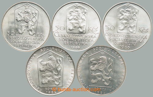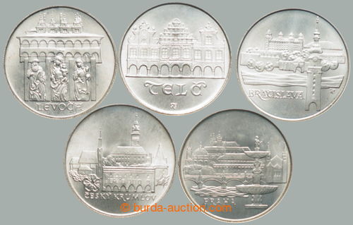 Numismatics. CZECHOSLOVAKIA 1945-92 / complete set 5 pcs of memorial/special Ag coins 50Kcs 1986 - Town pamatkove rezervace: Prague, Telc, Bratislava, Cesky Krumlov, Levoca; nice toned (Image) (Image2)