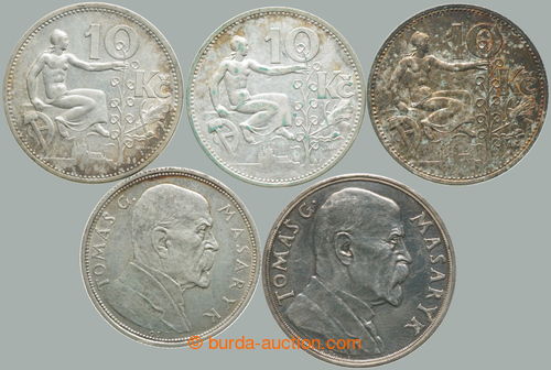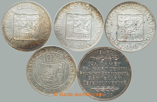Numismatics. CZECHOSLOVAKIA 1918-39 / 10 crown 1928, 1930, 1931, 1932 + Ag medal 85. birthday T. G. Masaryk 32mm; various quality, toned