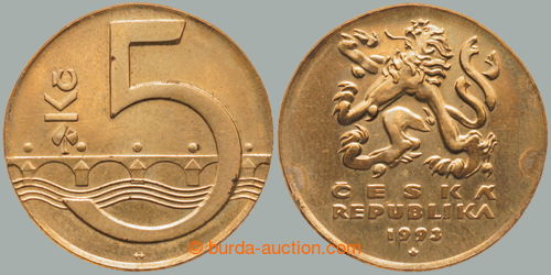 Numismatics. TECHNOLOGICKA ZKOUSKA / 5 crown 1993, mint Winnipeg, mosazny odrazek (technologicka trial Canadian mint), 3,88 g; very rare, exceptional usage, RR! (Image)