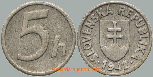 Numismatics. SLOVAKIA 1939-1945 / 5 haler 1942; small line marking/-s, otherwise nice zachovalost without usual hints koroze, rare face-value, R!