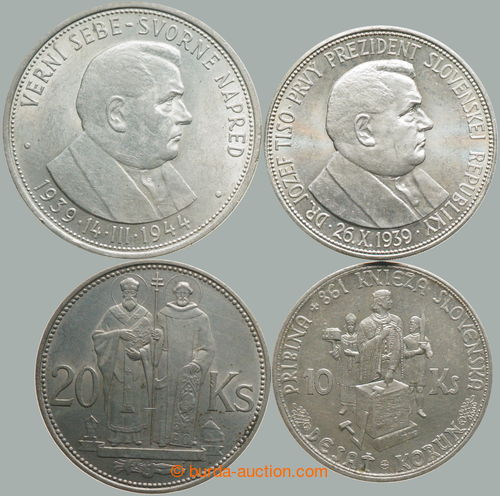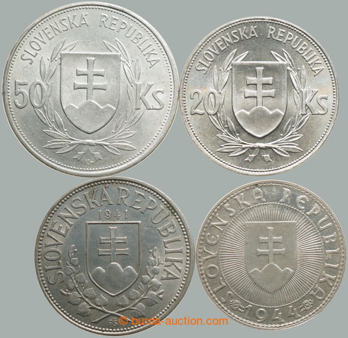 Numismatics. SLOVAKIA 1939-1945 / comp. 4 pcs of Ag minci: 50Ks 1944 - 5. anniv of Slovak republic + 20Ks 1939 - Tiso + 20Ks 1941, single cross on/for rotunde + 10 Koruna 1944, dagger on/for kaplici; sporadically small line
