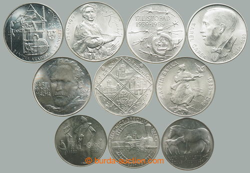 Numismatics. CZECHOSLOVAKIA 1945-92 / comp. 10 pcs of memorial/special Ag minci: 100Kcs 1986 - K. H. Macha, 50Kcs 1987 - Horse Prevalskeho, 100Kcs 1987 - Academy in/at Banska Stiavnici, 50Kcs 1988 - Juraj Janosik, 100Kcs 1988 -