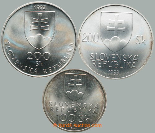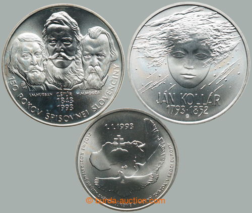 Numismatics. MC / comp. 3 pcs of Ag memorial/special minci: 100SKK 1993 - Origin Slovak republic, 200SKK 1993 - 150 years spisovne slovenstiny, 200SKK 1993 - Jan Kolar, placed in original plastovych kapslich; slightly toned (Image) (Image2)