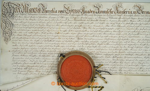 caused by in Vienna 9. August 1747, with autograph Maria Theresia and countersignature Johann Friedrich count Seilern; parchment 43x73cm, big seal in/at wooden box, in/at extraordinary quality, without prodrenych places etc..; totally readable text,
