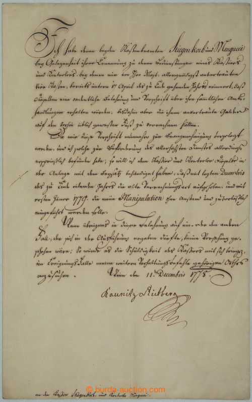 Autographs. VACLAV ANTONIN Z KOUNIC-RIETBERGU (1711-1794), Moravian nobleman, nejvyznamnejsi osobnost of family Kounicu and front figure celoevropskych history 18. century, politician, kancler Maria Theresa and jejich nastupcu,