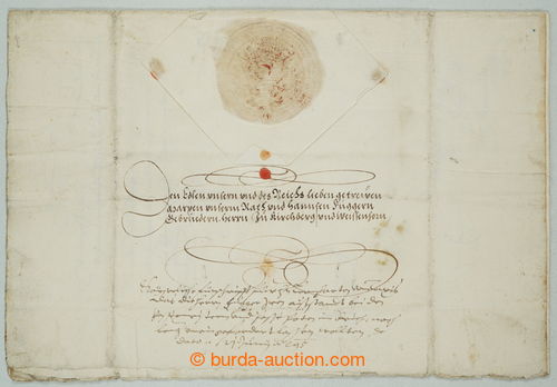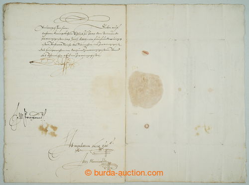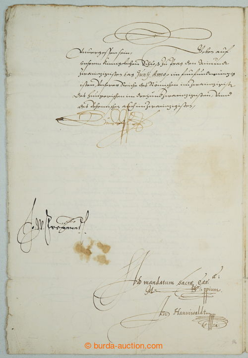 Autographs. RUDOLF II. (1552-1612), Roman emperor, Czech and Hungarian King, autograph on German psanem poselacim sheet - misivu addressed on/for hrabata Fuggery, caused by in Prague on/for Hrade 21. June 1595, interesting text