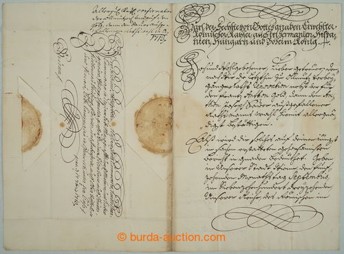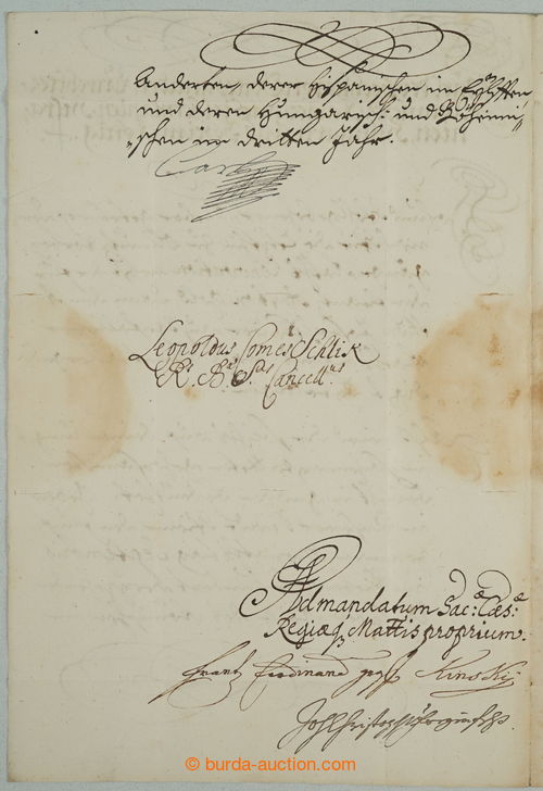 Autographs. LEOPOLD I. (1640-1705), Roman emperor, Czech and Hungarian King, son of Ferdinand III. and father Joseph I., imperial letter from year 1692, sent from Ebersdorfu; autograph emperor, then signature chancellor Francis