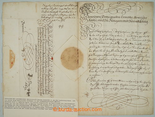 about authority postal service in/at Empire several days after/around designation Leonharda I. von Taxis generalnim postmistrem; 2x folded sheet with filigranem, nice preserved imperial seal with papirovym krytem, nevyrazne signs of age, overall nice