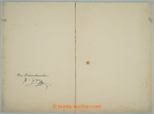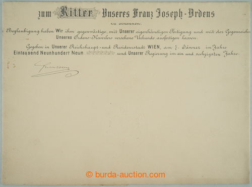 Autographs. imperial edict - povyseni to rytirskeho status in/at Order Franz Joseph for Col. Vincenze Ludviga with cyklostylovym signature emperor Franz Joseph I. Franziskus and hand-made signature chancellor order; good