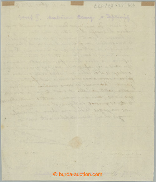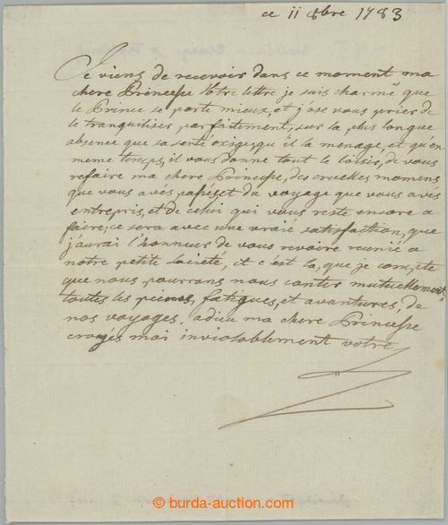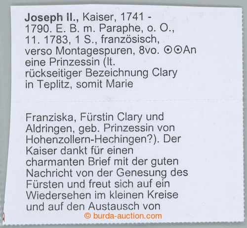 Autographs. JOSEPH II. (1741-1790), Roman emperor, Czech and Hungarian King, son Mary Theresie; VLASTNORUCNI PERSONAL LETTER knezne Mary Frantisce Clary and Aldringen, written French, according to prilozeneho German text it is