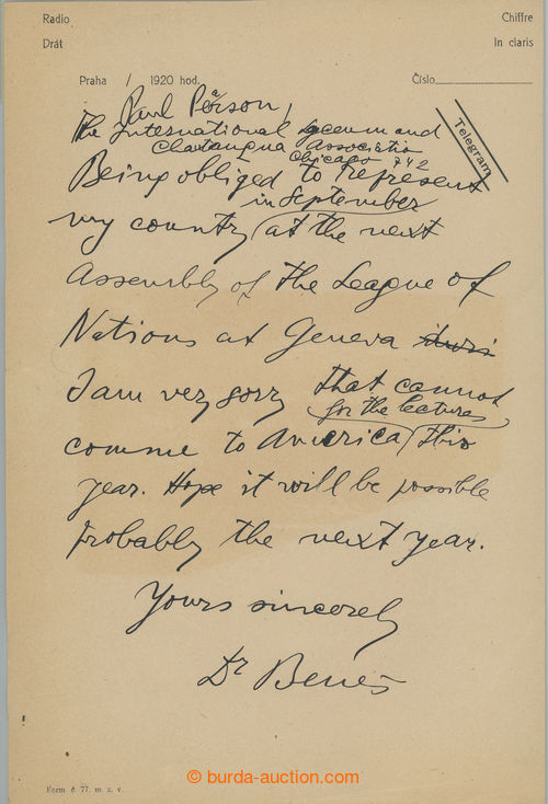 Autographs. BENES Edward (1884-1948), other Czechosl. president and foreign minister; handwritten in English written koncept telegram prezidentovi American cultural and vlivove organization Chautaugua Paulu Pearsonovi (Chicago) -