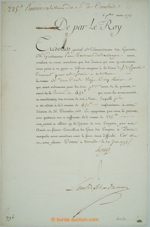 Autographs. LOUIS XVI (1754-1793), French King svrzeny and popraveny during Velke French revolution, autograph Louis on/for document De par Le Roy (From King), admission penze for penzionovaneho general and royal radce Guillaume