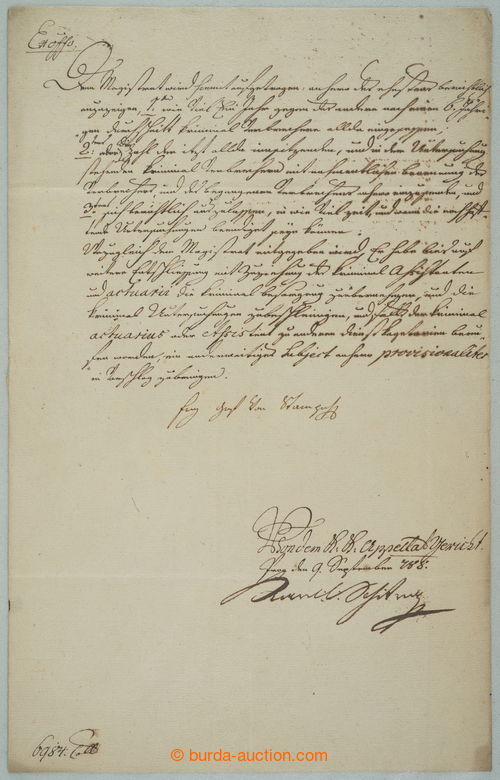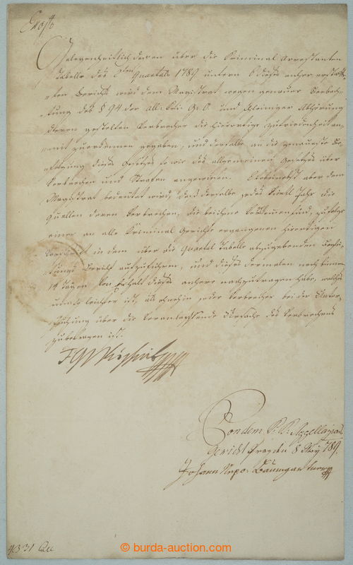 Autographs. KAGER ZE STAMPACHU Francis Wenceslas (1742-1804), Czech nobleman, politician and state urednik, zastaval function nejvyssiho purkrabiho and president Czech country gubernium, autograph on document, folded sheet paper