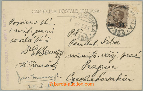 Autographs. BENES Edward (1884-1948), other Czechosl. president and foreign minister, handwritten three-line text with signature on Ppc sent from Italy on/for minister A. Srbu, attached spolupodpisy BENESOVA Hana (1885-1974), wife