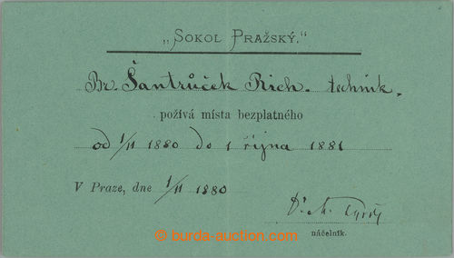 Autographs. TYRS Miroslav (1832-1884), important Czech national obrozenec, founder Sokol, academic pedagogue; autograph Dr. M. Tyrs on/for confirmation Sokol Prague; very nice in good condition condition, signatures M. Tyrse are