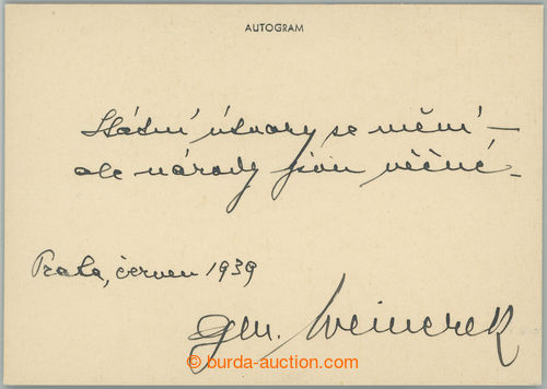 Autographs. WEINEREK Zdenko (1876-1958), Czechosl. General, prednosta presidia War Office, handwritten text with signature and dataci on card; very fine (Image) (Image2)
