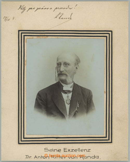 Autographs. RANDA Anthony knight (1834-1914), rektor Univerzity Charle's, Professor obcanskeho law, member of parliament, B/W photo on sheet with jednoradkovym text Vzdy for law and pravdu with dataci and signature; on reverse