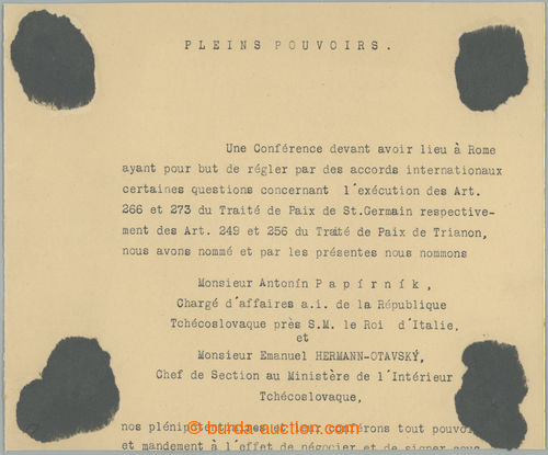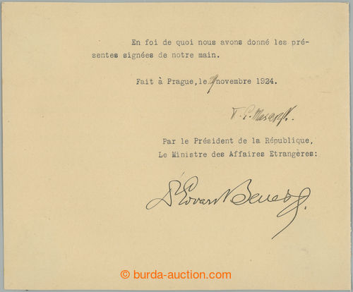 Autographs. MASARYK Thomas Garrigue (1850-1937) and BENES Edward (1884-1948), handwritten signatures on/for larger part document with French text - Udeleni pravomoci for act in Rome and On dukaz cehoz predkladame these documents