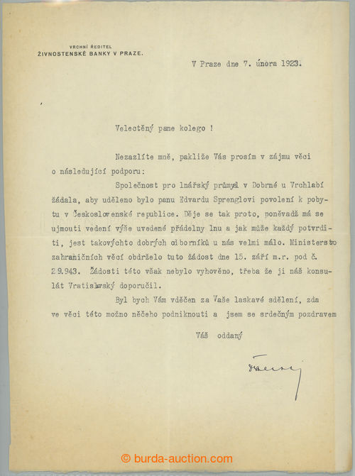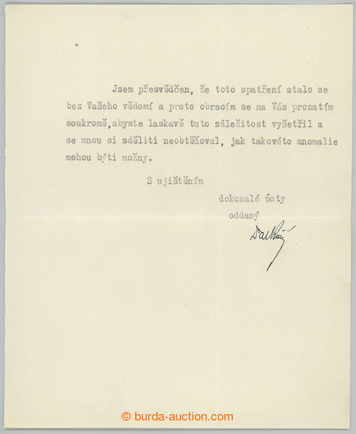 Autographs. PREISS Jaroslav (1870-1946), important Czechoslovak prvorepublikovy banker, narodohospodar, director of Trade Bank, politician mladoceske side/party and member of parliament; typed letter with one's own signature;