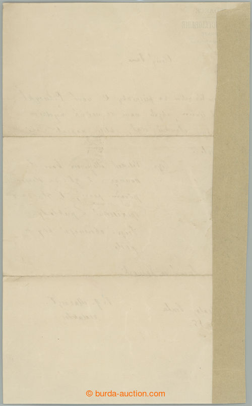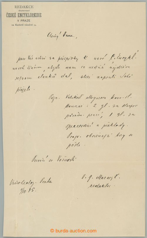 Autographs. MASARYK Thomas Garrigue (1850-1937), the first Czechoslovak President; handwritten letter from period of his action in/at editors Czech encyklopedie on/for Vinohradech; small tearing in/at L bottom margin, overall but