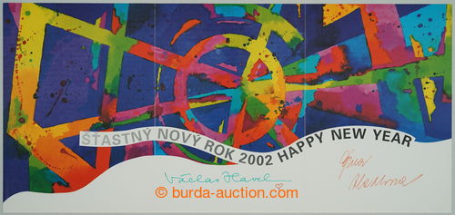 Autographs. HAVEL Wenceslas (1936-2011), Czechoslovak and Czech president + HAVLOVA Dagmar (*1953) Czech actress, wife V. Havel; handwritten signatures on request to New Year 2002 + also with 2 more/larger portrait photo V. Havel;