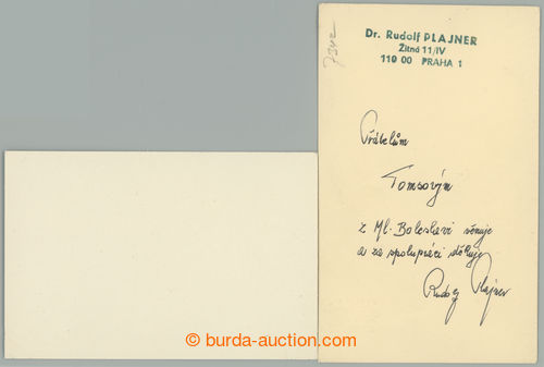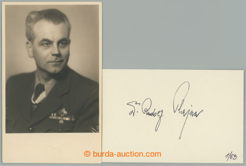 Autographs. PLAJNER Rudolf RNDr. (1901-1987), dlouholety important scout functionary and blizky spolupracovnik A.B. Svojsika, 2x autograph, 1x on the reverse side portrait photo with dedication, 1x on paper slip; very fine,